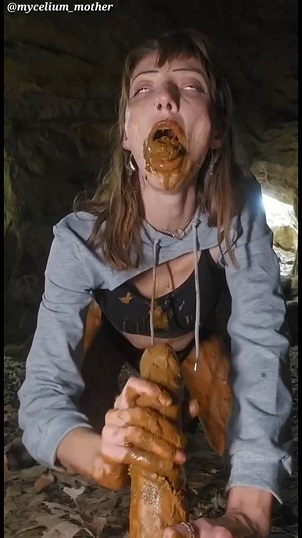 Mouthful of shit, she stands up and shows off her thin, petite, dirty body. Returning to her hands and knees, she chews up her huge mouthful of feces while exuberantly stroking your shit-covered cock. Attempt at swallowing with reactive gag and chokes her shit back up, she keenly keeps stroking and offers her shit coated mouth to swallow your load of sperm. Standing up, she straightens her clothes out and stretches her legs..